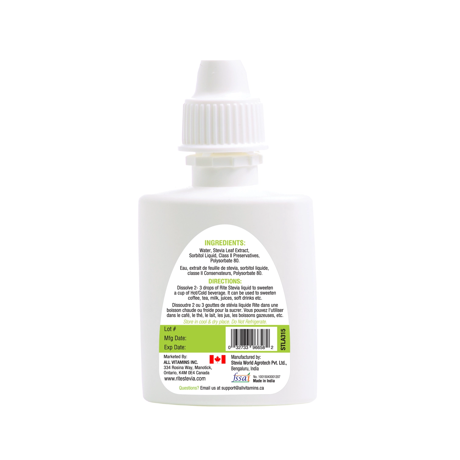 Ingredients: Water, Stevia Leaf Extract, Sorbitol Liquid & Preservatives