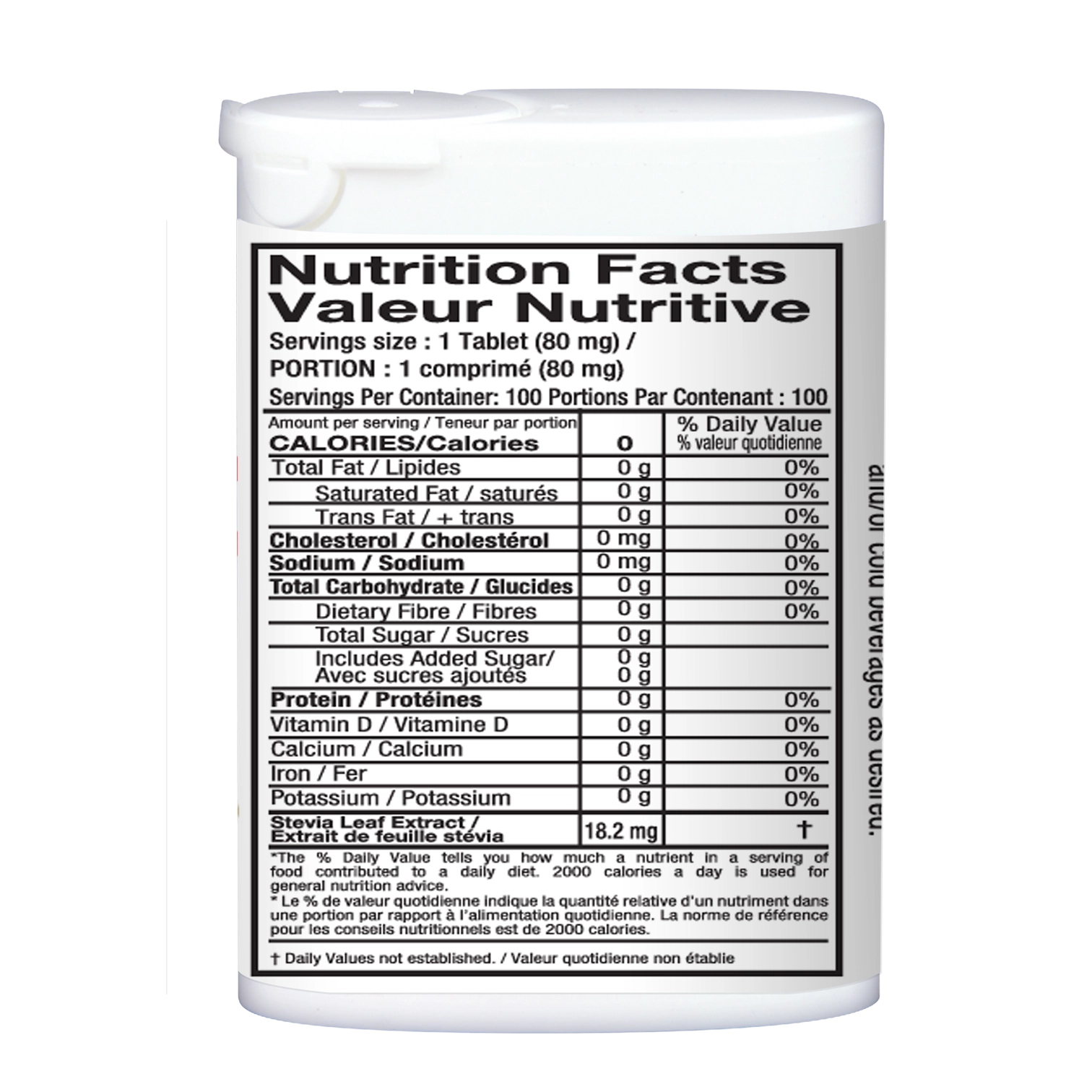 100 tablets per dispenser. 1 tablet ≈ 1 tsp sugar. Quick dissolving, gluten-free, ISO 22000 certified.
